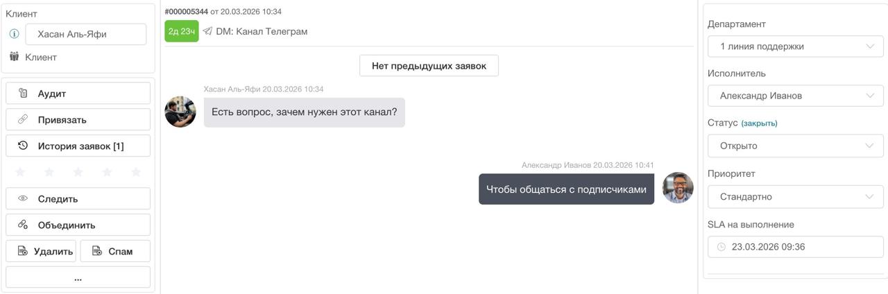 После чего сообщения от пользователей будут отображаться в хелпдеске и операторы смогут отвечать на них как на обычные заявки: