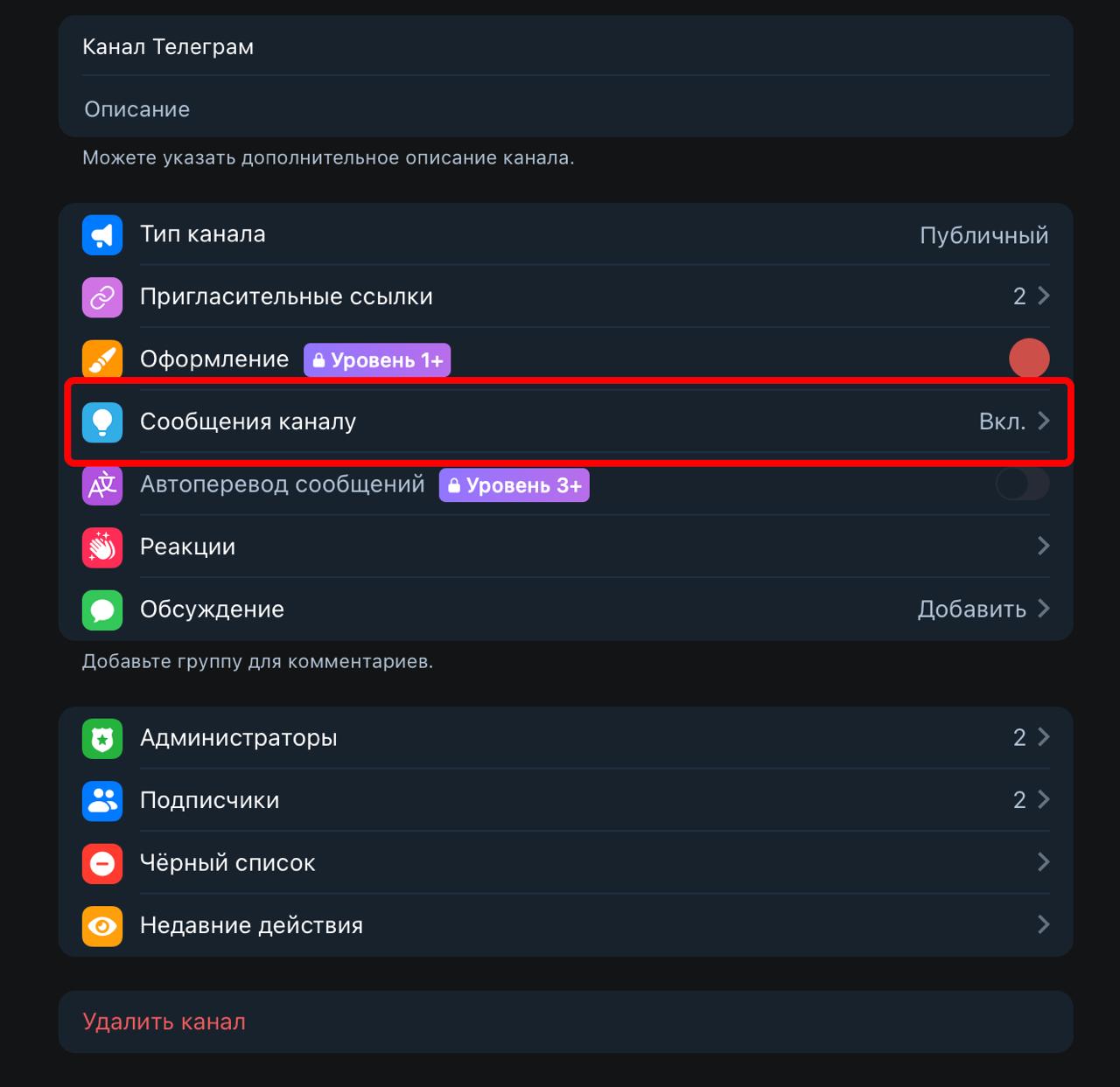 - Добавлена поддержка личных сообщений в каналах Telegram.