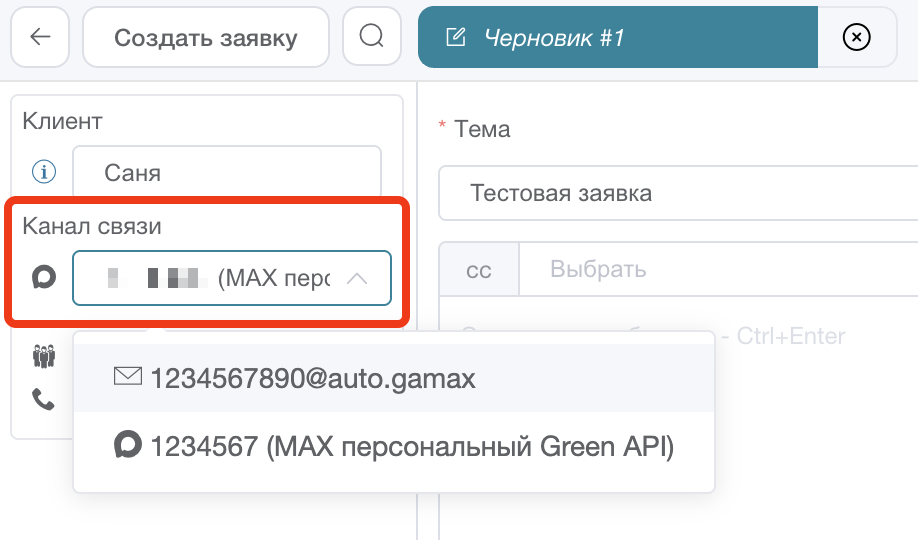 - При подключении персонального MAX от провайдера Green API появилась возможность инициации переписки с пользователем прямо из хелпдеска. Создайте заявку, выберите клиента, которому желаете написать, и в списке каналов укажите "MAX от Green API":