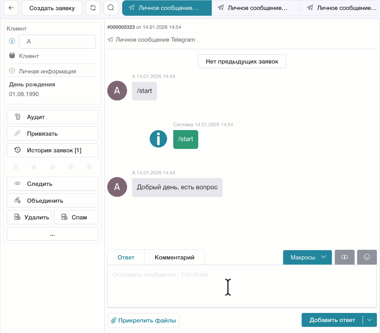 - Сегментация по каналам: вы сами выбираете, в каких типах обращений (TG, WA, VK и т.д.) должен срабатывать плагин.