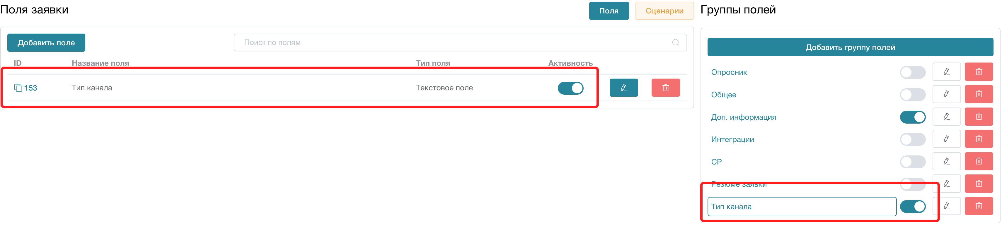 Шаг 1. В меню "Поля заявки" создайте текстовое поле (например, "Тип канала"):