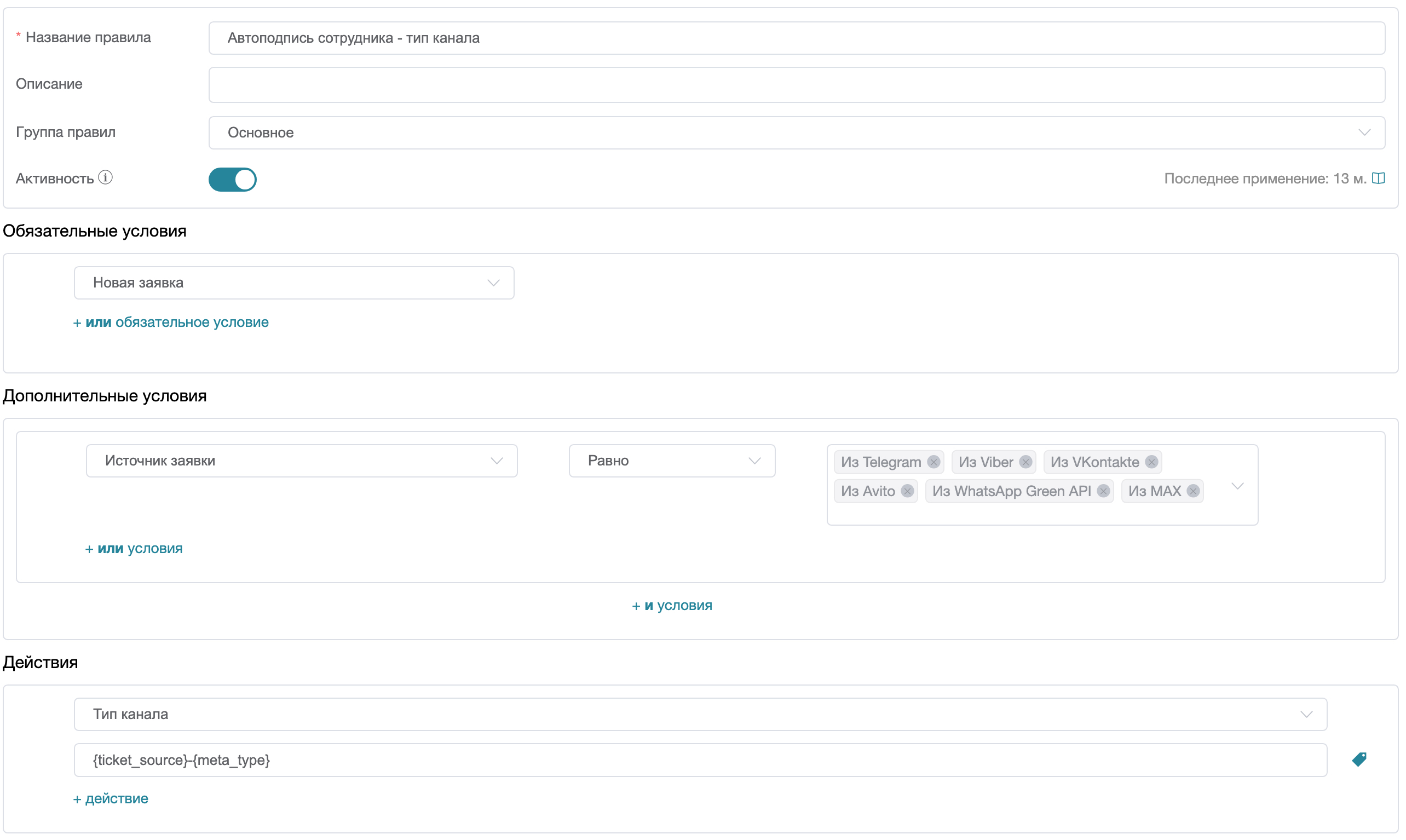Действие: Изменить значение поля [Ваше поле из Шага 1] на значение {ticket_source}-{meta_type}