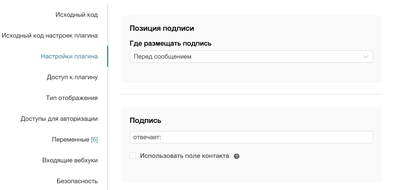 Плагин предназначен для автоматического добавления подписи сотрудников в ответах в различных каналах связи (Telegram, WhatsApp, VK и др.). Он избавляет сотрудников от необходимости вручную подписывать сообщения, добавляя имя оператора в начало или в конец текста Это особенно актуально для групповых чатов, где клиенту важно понимать, какой именно менеджер ведет диалог: