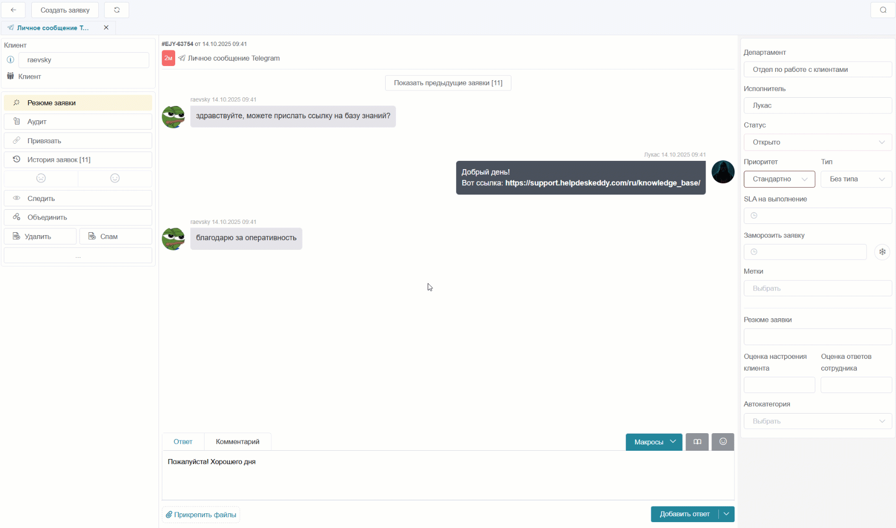 - Генерирует тему по переписке и автоматически меняет название заявки. Если предложенный вариант вас не устраивает, можно повторно сгенерировать новую тему нажатием на кнопку.