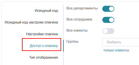 3) Во вкладке "Доступ к плагину" укажите департаменты, в заявках которых будет отображаться кнопка "Резюме заявки", а также группы сотрудников имеющие к ней доступ: