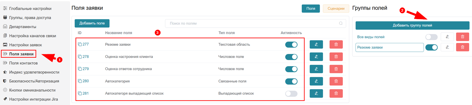 Для создания полей перейдите в меню "Поля заявки". Создайте отдельную группу полей и укажите в ней департаменты, в которых будут отображаться будущие поля. Затем создайте 4 поля (тестовая область, два числовых и поле с выпадающим или связанным списком, где будут храниться категории заявки):