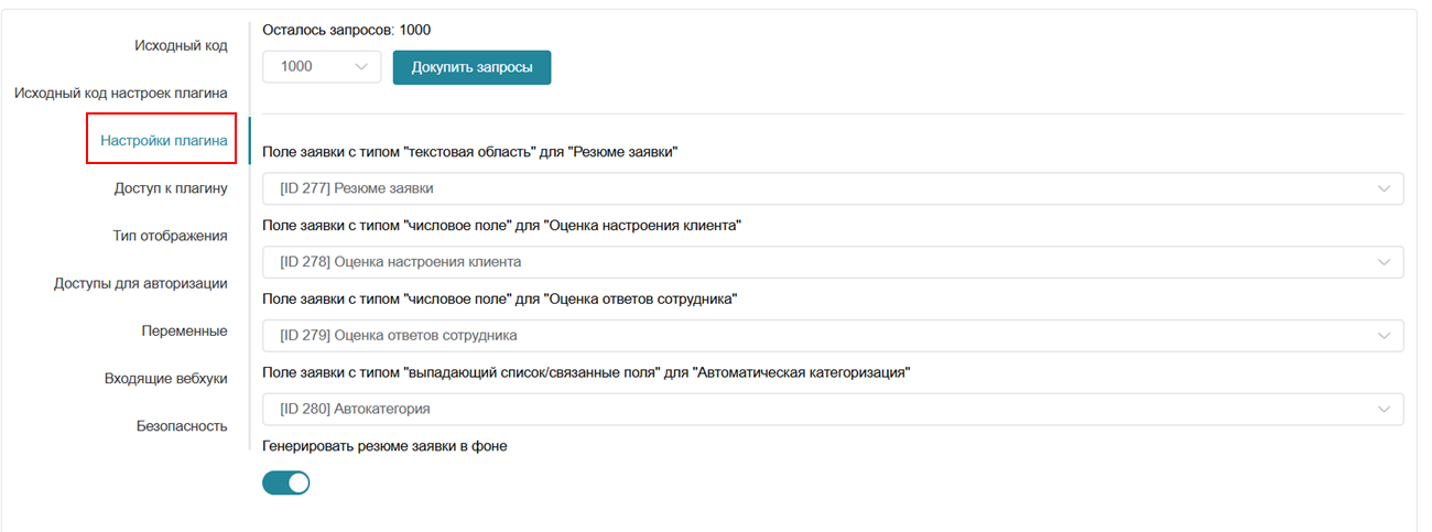 - Если включена настройка "Генерировать резюме заявки в фоне", то резюме будет генерироваться только в заявках у которых есть поле "Резюме заявки" и они находятся в статусе "Выполнено". Если настройку выключат, то будут сгенерированы резюме для заявок за последние 20 минут от времени включения.