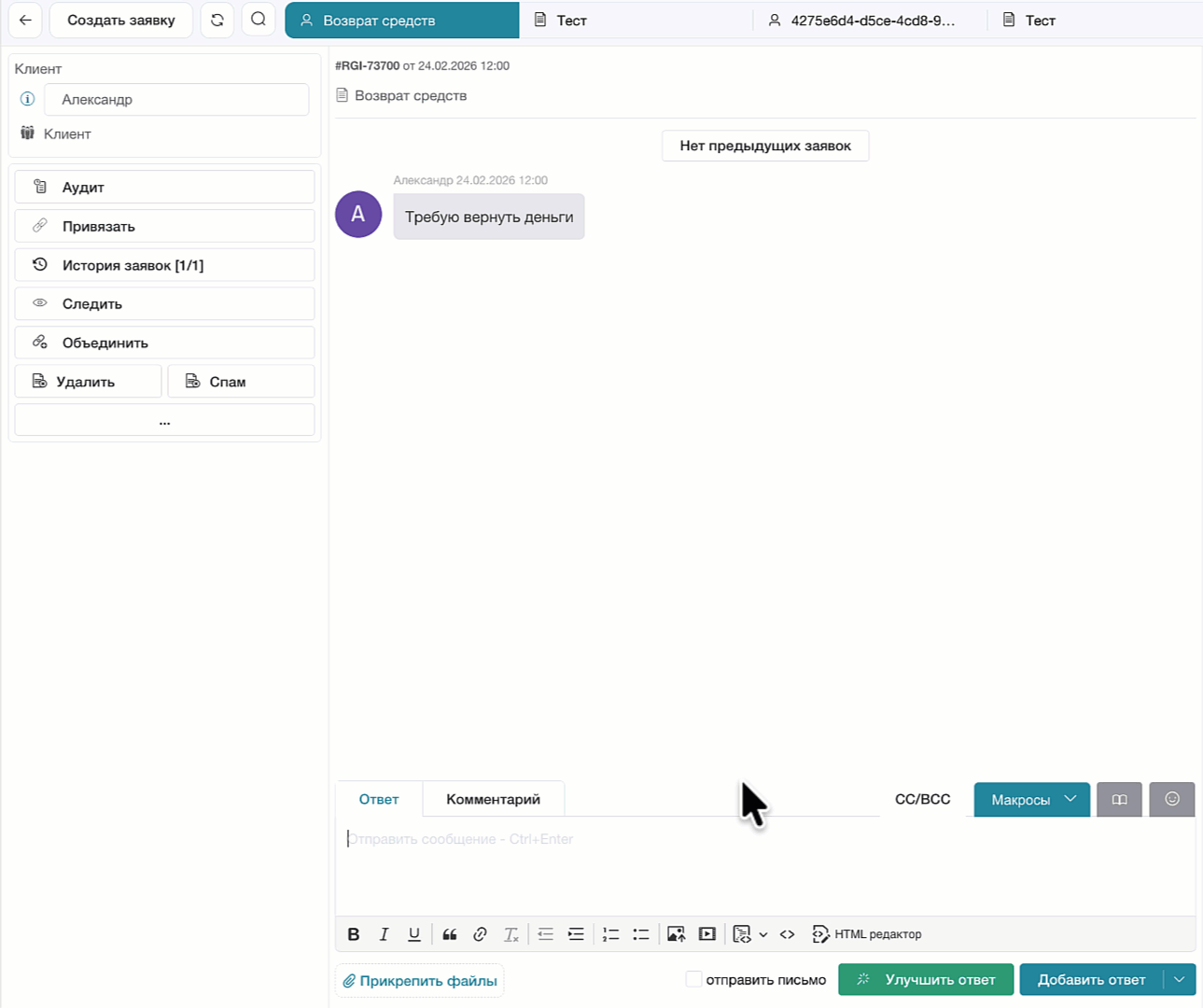 Кнопка «Улучшить ответ» доступна как внутри существующей заявки, так и в окне создания новой. Процесс работы выглядит следующим образом: