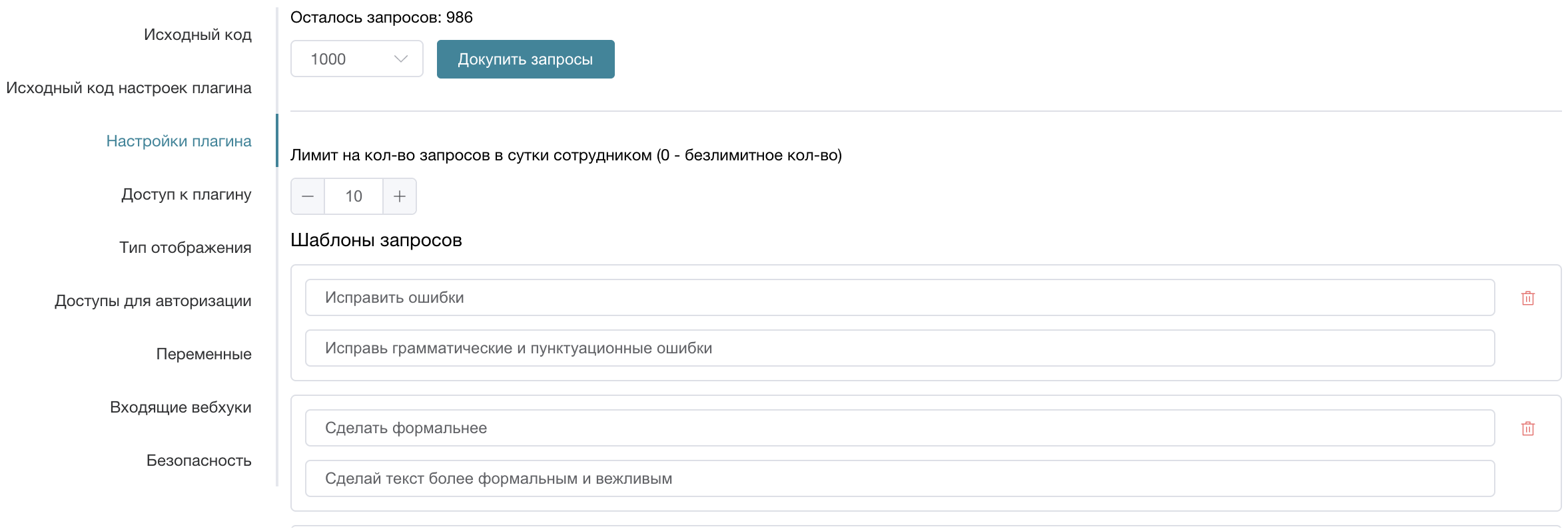 - Плагин является платным, каждая активация плагина стоит 4 рубля (1 запрос). Количество оставшихся запросов можно посмотреть в разделе "Настройки плагина", там же можно докупить новые запросы — выбранная сумма будет списана с баланса вашей системы.