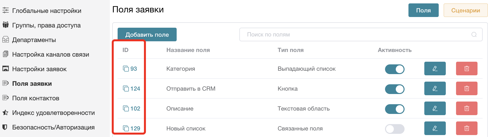 Для установки плагина перейдите в меню "Маркетплейс/плагины", выберите нужный плагин из списка и нажмите "Установить". Для настройки плагина необходимо открыть вкладку "Переменные" и добавить новую клиентскую переменную "fieldId", а в качестве значения укажите id кастомного поля (меню "Поля заявки"), значения из которого должны дублироваться в метках. Обратите внимание, что плагин работает с полями типа "Связанный список", "Выпадающий список", "Кнопка", "Мультикнопка".