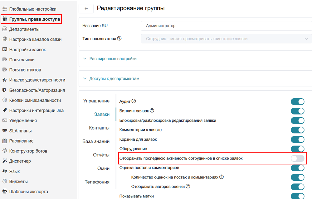 - Метки и блок с операторами. Метки можно свернуть, а блок «Операторы в сети» ("Последняя активность") теперь отключён по умолчанию — его можно включить для нужных групп в разделе «Группы, права доступа → Заявки»: