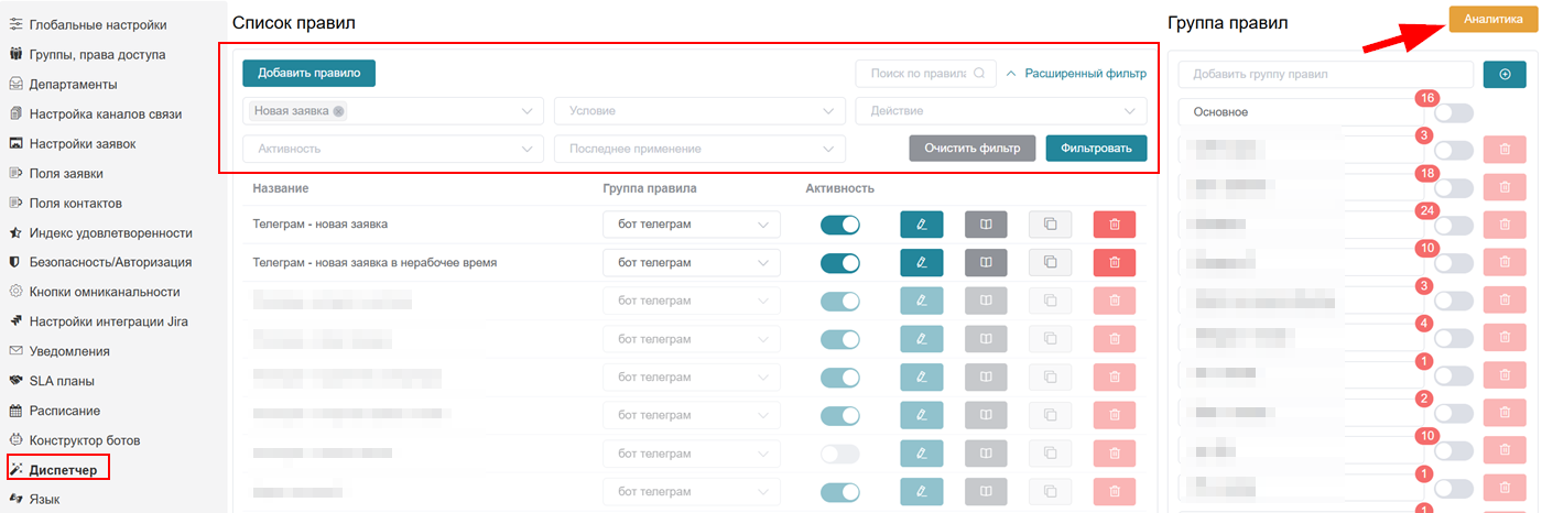 - В Диспетчер добавлен расширенный фильтр правил и аналитика применения правил в заявках.