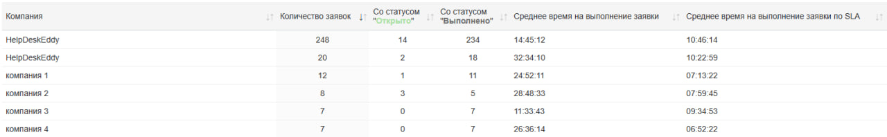 Отчёт показывает, насколько быстро и качественно обрабатываются заявки от каждой компании. Если у ключевого клиента среднее время ответа превышает SLA — это повод для разговора с командой поддержки.