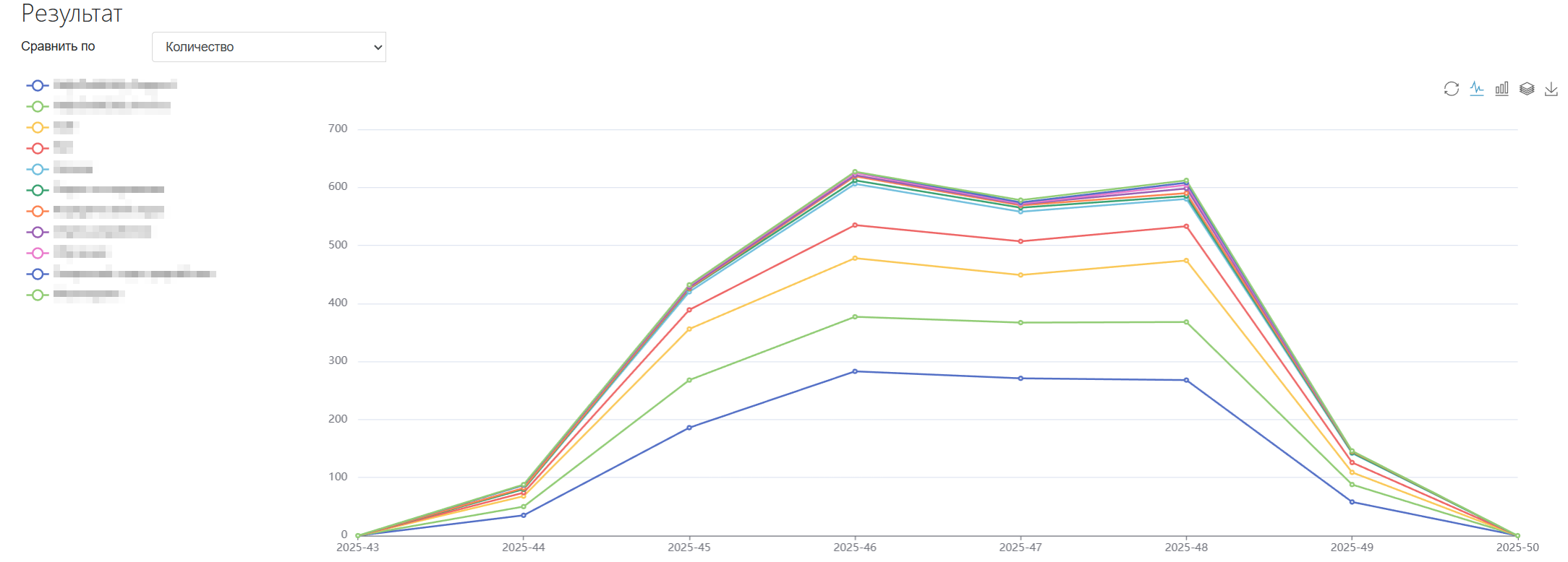 - Линейная диаграмма — идеальна для отслеживания трендов во времени (например, рост числа обращений по неделям);